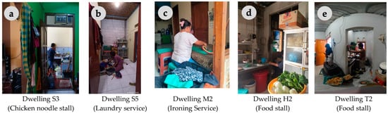 In the case of Indonesia, urban informal settlements serve as both living spaces and HBEs, encompassing a variety of small, informal businesses that support household livelihoods. The characteristics of HBEs within informal settlements in Indonesia have been studied in the fields of labor economics [25,29] occupational public health [30], and urban/architectural planning [31,32,33,34]. For example, Kusumaningdyah et al. conducted a field survey of HBE housing in urban slums in Surakarta City [35]. Their research identified the diversity of businesses and how home-based workers utilize their limited small housing space for multiple functions, including both living and business activities.