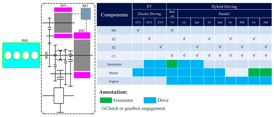 Based on the P2–P3 hybrid powertrain system, the configuration characteristics are divided mainly into operating modes.