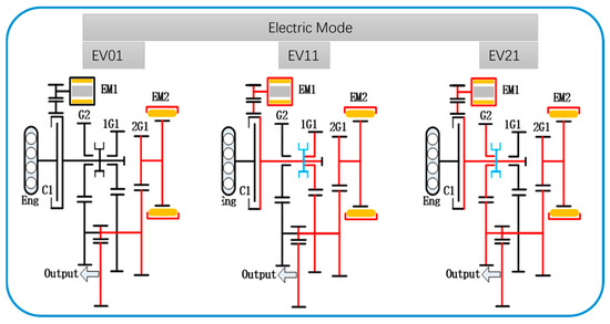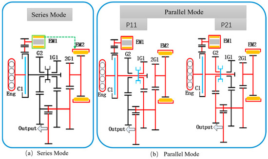 As shown in Figure 2a, in the series mode, the engine drives EM1, which acts as a generator, to charge the power battery. The ATM gearbox is neutral; now, EM2 is the sole power source for the driver’s power demand. Because the engine and EM1 are decoupled from the output end at this time, the optimal operating range can be maximally ensured within the working ranges of the engine and EM1, guaranteeing an optimal fuel conversion rate. However, the energy conversion efficiency is low due to the long energy transmission path and multiple conversions. Therefore, this operating mode is suitable mainly for low speeds or city road conditions that require frequent start–stop cycles.