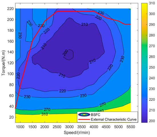 The engine serves as a key energy provider within a hybrid powertrain system. Due to the complex nonlinearities of the engine system, it is challenging to apply it directly to optimization control problems. Therefore, in order to simplify the model, the constructed quasi-static model of the engine is used for simulation. The effective fuel consumption (BSFC) of the engine and the maximum torque line of the engine is depicted in Figure 4. The gradient of colors stands for the effective fuel consumption; its unit is g/kWh.
