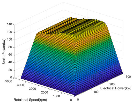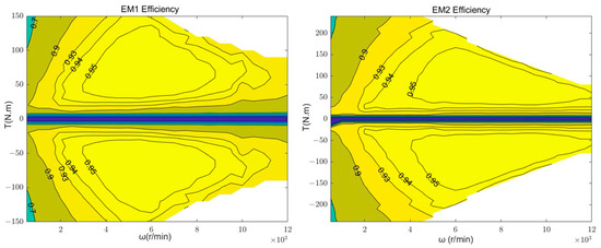 The motor’s efficiency () depends on the motor torque and speed in the equation. The motor efficiency diagram is shown in Figure 5.