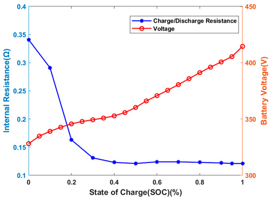 The capacity of the battery, as well as the charging and discharging rates, directly impacts the performance of HEVs. By simplifying the battery to a zero-order equivalent circuit comprising a voltage source and internal resistance while disregarding the impact of other factors on charging and discharging efficiencies, the formula for calculating the battery’s state of charge is as follows:
