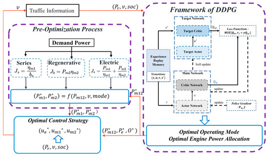 In summary, RL plays a significant role in achieving rapid algorithm convergence and superior fuel economy efficiency. In this study focusing on the KunTye 2DHT hybrid powertrain system, a pre-optimized deep reinforcement learning logical framework is constructed. Firstly, given the system configuration and actual operational conditions, the working modes are categorized into three types. Based on the characteristics of each mode, static optimization problems are established to pre-optimize the optimal power distribution for each mode. Secondly, the DDPG algorithm is utilized to achieve optimal mode switching, gear selection, and engine power distribution. Combining these outcomes with the pre-optimized results further refines the power distribution for improved efficiency. Finally, based on the metrics in the reward function of DDPG, energy consumption is minimized during vehicle operation while a planned SOC change curve is obtained. Therefore, a planned global SOC change curve under the condition of minimizing energy consumption can be obtained.