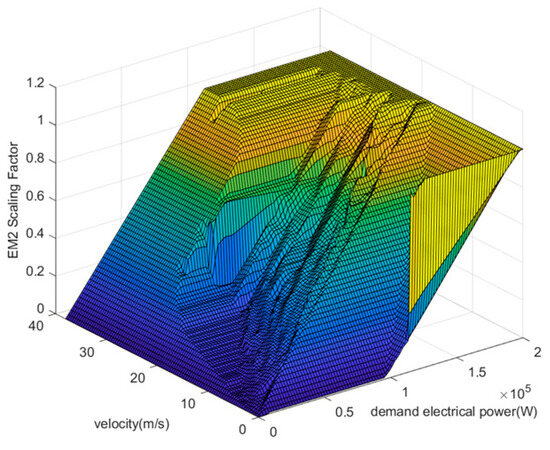 The power distribution of EM2 when the gearbox is in second gear is shown in Figure 10. The EM2 scaling factor indicates the ratio of the output power of motor 2 to the maximum power. And the different color in Figure 10 represents the change in the size of the scaling factor.