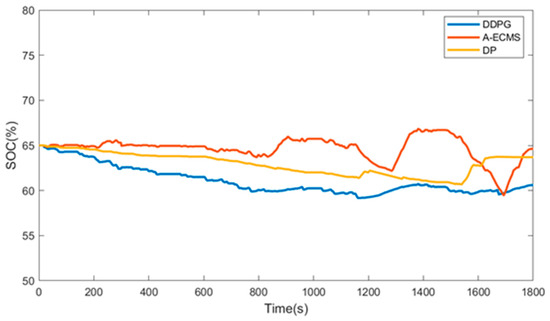 Table 2 illustrates the fuel consumption and SOC terminal values for three strategies. Given that DP can obtain a globally optimal control sequence offline, resulting in minimal fuel consumption, DP is the benchmark for comparing against A-ECMS and DDPG. The minimum fuel consumption per hundred kilometers under the WLTC condition is 3.721 L/100 km, as calculated by DP. As shown in Table 2, the fuel economy of DDPG, which reaches 95.21% of DP, is much higher than that of the A-ECMS strategy, which reaches only 91.29%. Therefore, the DDPG strategy demonstrates a closer approximation to the optimal solution of DP than A-ECMS.