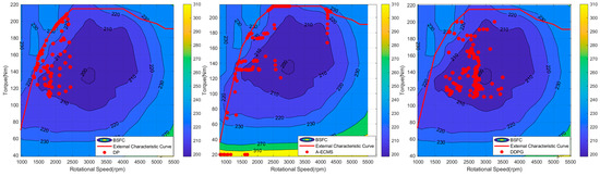 From Figure 14 depicting the SOC trajectory, it is evident that DP, ECMS, and DDPG all exhibit better SOC maintenance performance. However, the SOC curves under these three control strategies differ significantly, primarily attributable to their disparate power allocation demands between the engine and motors at each moment. DP embodies global optimization based on the entire operating condition, thus achieving globally optimal SOC control. It initiates SOC control with a gradual decline to ensure the engine operates along the efficient curve while fully harnessing regenerative braking energy during the driving cycles, maintaining SOC near the reference value to prevent excessive depletion and reducing instances where the EM1 charges the battery. In contrast, A-ECMS initially maintains SOC well, but the equivalent factor varies with SOC, altering the equivalent fuel consumption derived from the battery discharge. Increased battery discharge tends to favor more engine usage. At the same time, the EM1 charges the battery to elevate SOC, maintaining an appropriate level of equivalent fuel consumption, albeit at the cost of increased fuel consumption for battery charging. Combining DDPG, a rule-based, pre-optimized algorithm, ensures smooth SOC descent and ascent, effectively maintaining SOC levels, with its trend closer to DP control’s SOC trajectory than A-ECMS. DDPG relies primarily on battery discharge to judiciously initiate engine operation, minimizing instances in which EM1 charges the battery. It balances power demands between the motor and engine. It optimally allocates power demands across different modes based on rule-based, pre-optimized results to optimize the utilization of battery charging and discharging for efficient engine operation and improved fuel economy. From the map of the engine working points in Figure 15, it is evident that the operating points controlled by DP and DDPG are more concentrated compared to ECMS, mainly residing within the high-efficiency region of the engine. This observation underscores the efficacy of the rule-based, pre-optimized DDPG algorithm in controlling engine operation within the high-efficiency region which makes its SOC curve descend and become lower than A-ECMS.