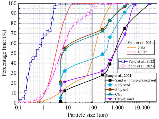 The discharge of BTs occurred during the grinding and washing of raw bauxite ore, resulting in potential soil structure damage. Throughout the process of pumping and warehousing, the properties of BTs exhibited spatiotemporal variability influenced by time and location. What’s more, the composition of BTs particles stored at different locations within the tailing reservoirs demonstrated variation. Coarse-grained silty sand settled near the discharge outlet due to gravitation, while fine-grained clay and silty sand gradually deposited towards the central and surrounding areas of the depression through hydraulic sorting. Figure 2 shows the particle size distribution curves of BTs. Jiang et al. [29] indicated that near the discharge outlet, the majority of particles comprised silty sand, while the remaining particles consisted of sand with fine-grained soil. The central region of the waste reservoirs predominantly consisted of clay and clayey sand, where clay is approximately half of the total mass, while silty soil and clayey sand accounted for the remaining portion. It can also be seen from Figure 2 that BTs used in most studies [25,30,31] were classified as clay according to GB/T 50145-2007. The median particle size (D50) obtained from the laser particle size analyzer was within 0.52 μm [25]. The proportion of BTs with a particle size smaller than 69.5 μm was close to 90% [31]. The frequency of powder separation had a great influence on particle size distribution. Zhou et al. [30] showed that with the frequency increased, the particle number less than 6.0 μm increased significantly, as shown in Figure 2.