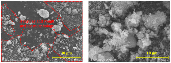 BTs samples from Guangxi, China, were analyzed using a Hitachi S-3400N scanning electron microscope (SEM), and the SEM microstructure is presented in Figure 3. It is evident from the figure that the dissolution of alumina resulted in an irregular and rough surface morphology of BTs particles, leading to a significantly large specific surface area and heightened adsorption activity. This was consistent with the conclusion drawn by Anawati et al. [32], which indicated that the surface area of BTs was 21.98 m2 /g, and a large surface area of BTs was available for the digestion reaction. Moreover, in the presence of an alkaline environment created by cement, the contact surface between BTs and OH- ions was larger, which made BTs more susceptible to be activated and exhibit notable chemical activity.