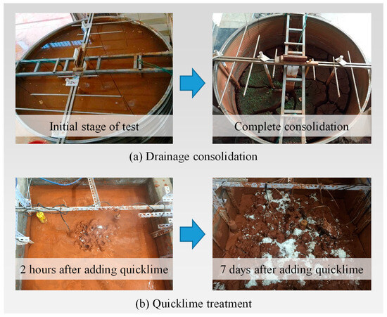 Consolidation technology is the predominant method employed for the treatment of BTs with high water content, as demonstrated in the model test shown in Figure 4. The newly reclaimed BTs exhibited a water content of up to 300 wt% and displayed a flowing surface. To lower the water content of BTs, mud-water separation technology was utilized. Post-separation, the sediment has a water content of about 100 wt% [57]. However, in a natural drainage state, the fine particles would seep along with water, forming localized regions of extremely low permeability with varying thicknesses near the drainage system. These dense areas ultimately impeded effective drainage, leading to the water content of BTs ranging from 60 wt% to 75 wt% at different positions after the completion of self-weight drainage. To further enhance the dewatering process of BTs, applying a controlled vacuum load with three drainage paths reduced the water content from 281.9 wt% to 53.6 wt% within 60 h [57]. Moreover, a step-by-step stacking test of BTs with sand and a model test involving quicklime curing were recommended [11]. The results revealed that following the addition of quicklime, the average water content of BTs in the sand stacking model decreased by 19.9 wt%.