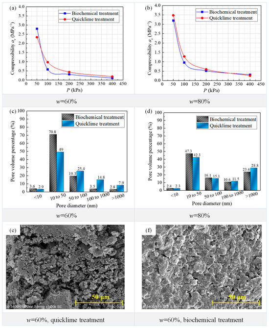 Effects of biochemical treatment and quicklime treatment: (a,b) represent av-P curves for BTs; (c,d) represent pore volume percentage under different treatment; (e,f) represent BSE images to show microstructure of quicklime treatment and biochemical treatment, respectively. (Data are from Ou et al. [59]).