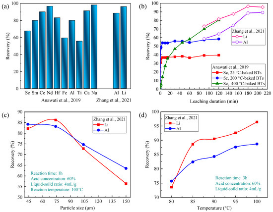 The leaching rate of elements was closely related to leaching time, the particle size of BTs, and reaction temperature, as shown in Figure 6b–d. It can be seen from Figure 6b that with the increase in reaction time, the leaching rates of Sc, Li, and Al gradually increased and tended to be stable, but the stability time of each element was different [32,38]. The baking temperature of BTs had a great influence on the leaching rate and stability time. With the increase of baking temperature, the leaching rate of Sc increased, and the time of leaching rate reaching stability is longer [32]. It can be seen from Figure 6c that the extraction efficiency of Al and Li decreased with the increase particle size of BTs [38]. The reduction of particle size was beneficial to leach Al and Li because with the gradual decrease of particle size from 150 µm to 44 µm, the mineral dissociation rate increased, and the exposed area of each particle increased. The increase of the contact area between particles and acid solution can improve the reaction efficiency. However, when the particle size continued to decrease to a certain size, the acid solution consumed on the particle surface could not be replenished rapidly, resulting in a decrease in the reaction rate and a reduction in the leaching rate of Al and Li. Therefore, the results showed that 74 µm of BTs was the best extraction size for Al and Li. Figure 6d shows that as reaction temperature increased, the leaching rates of Al and Li were greatly increased, and there was still a trend of continuous increase [38]. Therefore, 100 °C was selected as the best temperature for Al and Li extraction.