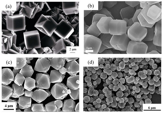 BSE images of the zeolite samples: (a,b) represent the zeolite 4A samples synthesized by two methods; (c,d) represent the zeolite X and zeolite Y samples, respectively [13,14,15,16].