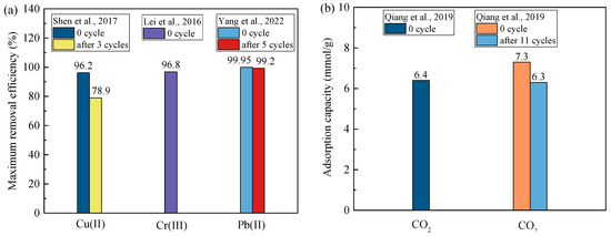 Maximum removal efficiency: (a) heavy metal ions; (b) CO2. (Data are from Refs. [14,15,16,34,66]).