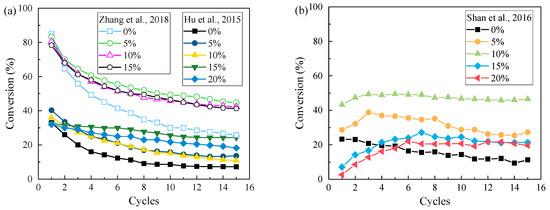 Carbonation conversion of CaO-based adsorbent prepared with different BTs/CaO ratios: (a) Refs. [17,52]; (b) Ref. [4].