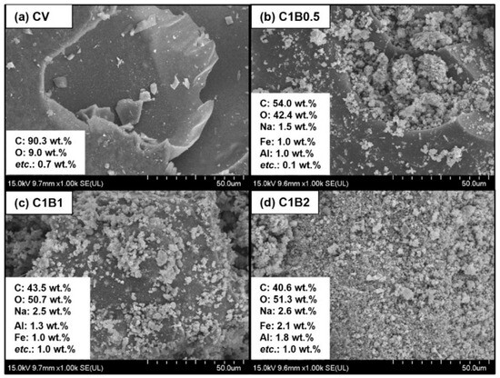 FE-SEM/EDX of metal-biochar [56]: (a) CV; (b) C1B0.5; (c) C1B1; and (d) C1B2. Note: C1B0.5, C1B1, and C1B2 represent the mass ratios of CV to BTs of 1:0.5, 1:1 and 1:2, respectively.