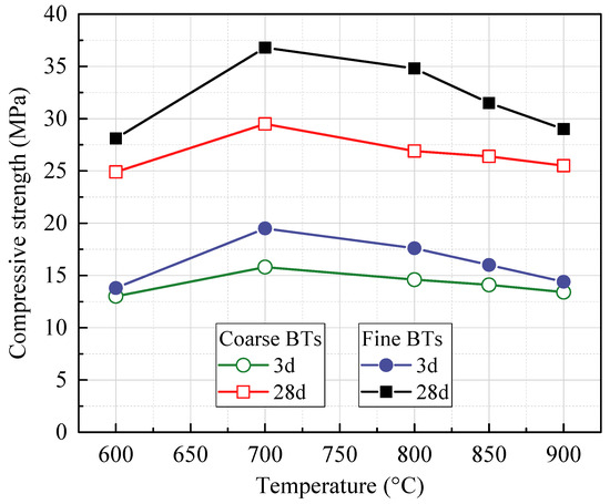 Compressive strength of mortar including coarse BTs and fine BTs at different activation temperatures (Data are from Zhou et al. [23]).