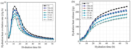 Hydration heat evolution rate (a) and cumulative hydration heat curves (b) of paste samples for 72 h (Data are from Zhou et al. [30]). Note: T0 is the pure cement; T80-20 signifies that the separation frequency of BTs is 80 Hz and the BTs content is 20% by weight; others are similar.