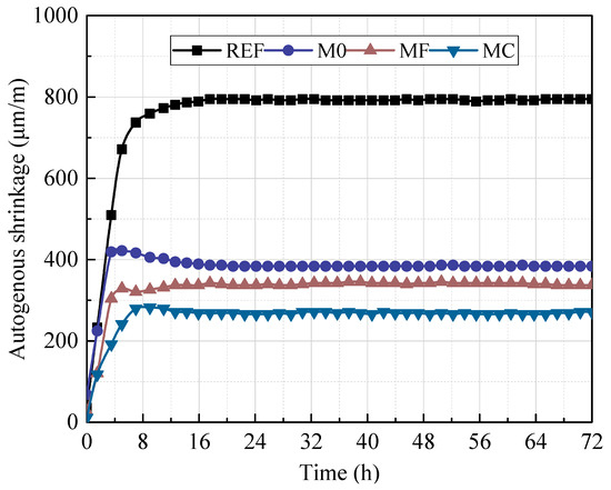 Autogenous shrinkage of mortars (Data are from Yang et al. [1]). Note: REF represents the mortar without LWA; M0, MF, and MC represent the mortars mixed with LWA, LWA + 10 wt% CaF2, and LWA + 20 wt% CaCO3, respectively.