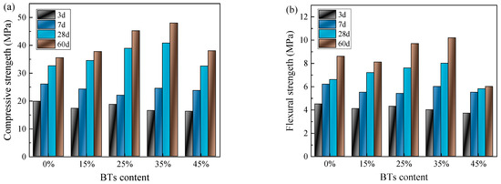 Using BTs as a fine aggregate to replace natural sand in 3D-printed mortar formulations proved effective [31]. Incorporating BTs reduced fluidity, slump, and setting time while delaying cement hydration. This addition also significantly increased the static yield stress, dynamic yield stress, plastic viscosity, and thixotropy of the mortar. As BTs content increased, both macroscopic and structural deformation rates of the 3D printed components gradually decreased. Compressive and flexural strengths initially increased but later declined (Figure 17). The optimal BTs to natural sand ratio was found to be 35%, offering favorable workability and high mechanical strength for 3D-printed mortar.