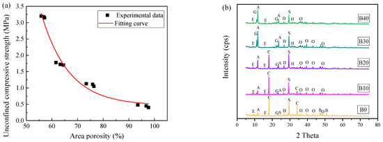 A foamed mixture of lightweight soil is a widely used geotechnical material in projects like soft foundation treatment, road widening, and subgrade backfilling [73]. Ordinary Portland cement, commonly used in its preparation, significantly contributes to carbon emissions (0.8–0.95t CO2 per 1t of cement). This has led researchers to seek alternatives, such as alkali-activated industrial solid waste, to partially or fully replace cement. A foamed mixture of lightweight soil with BTs (FMLSB) has shown promising performance [5]. At a density of approximately 500 kg/m3, the FMLSB exhibited unconfined compressive strengths between 0.31 MPa and 0.71 MPa. Adding 10–40% BTs yielded 7-day unconfined compressive strengths, reaching 73–83% of the 28-day strength. These mixtures also demonstrated water absorption rates of 25.7–43.1% and water stability coefficients above 0.7, indicating good early strength and durability. Increased area porosity led to an exponential decrease in unconfined compressive strength (Figure 18a). Analysis of the chemical composition of FMLSB revealed the presence of calcium silicate hydrate (C-S-H), calcium hydroxide crystals (C-H), hydrated calcium aluminate (C-A-H), hydrated calcium aluminosilicate (C-A-S-H), and a small amount of ettringite (AFt), as demonstrated in Figure 18b. BTs were roasted at 600 °C for 2 h, then mixed with phosphoric acid and subjected to two heat treatments, and used to synthesize aluminum tri-polyphosphate, an anticorrosion pigment [42]. This pigment exhibited enhanced pH (7.2), whiteness (85.4%), and an average particle size of 4.8 μm, surpassing industry standards when compared to the unmodified form.