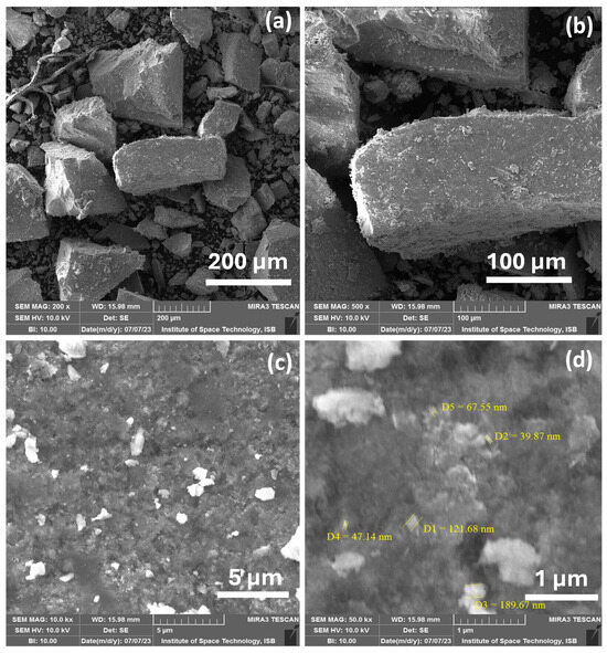 For the morphological studies of the synthesized Fe-Ni-Co-based trimetallic nanocomposite, SEM was carried out. SEM images were taken at 200 and 500× magnification, as shown Figure 2a,b. The agglomerated particles can also be seen in high resolution images (10 kx and 50 kx) in Figure 2c,d. A high surface energy can cause nanoparticle agglomeration, as particles try to reduce their total energy by coming in to contact with one another, which leads to lower catalytic activity. Figure 2d illustrated the average particle size, ranging from 39 to 189 nm.
