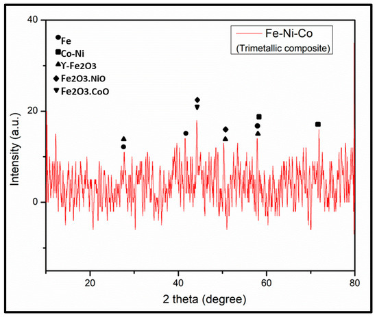 The X-ray diffraction (XRD) pattern was recorded with a powder diffractometer (D5000, Siemens; Cu-Ka1, 2 radiations) in the 2θ range of 10–80° with a step size of 0.025° (0.4 s/step), as shown in Figure 4. The assignment of the peaks has been carried out with reference to XRD patterns of Fe, Ni and Co nanoparticles [28,29,30]. The diffraction peaks at 44° and 50.62° correspond to the (111) and (200) planes of FeNi4.34, respectively, which correspond with FeNi JCPDS # 03-1109 [31]. All the observed XRD peaks positions were compared with JCPDS data (NiFe2O4, JCPDS no. 54-0964; CoFe2O4, JCPDS no. 22-1086; γ-Fe2O3, JCPDS no. 39-1346) [32]. The observed XRD pattern showed the amorphous nature of the synthesized trimetallic composite.