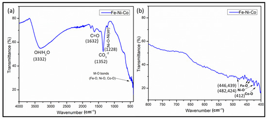 In the FTIR analysis (Figure 5a,b), several absorption bands were observed that provide valuable insights into the composition of the synthesized nanoparticles. Initially, a broad absorption band at 3332.5 was observed, which may be attributed to stretching vibrations in the –OH group. This peak may arise due to the absorbed moisture on the catalyst surface when FTIR analysis was carried out [33,34]. The absorption peak at 1630 corresponds to the stretching vibration peak in C=O. Some additional peaks were also observed at around 500 to 400 cm−1, which are related to the metal oxide bond which belongs to the Co-O, Ni-O and Fe-O vibrations. A lower frequency band at 415 cm−1 is assigned to the stretching mode of the M–O bond in the octahedral sites. Peaks at 482, 424 cm−1 are assigned to Ni-O and peaks at 446 and 439 cm−1 are assigned to the Fe-O bond [34,35].