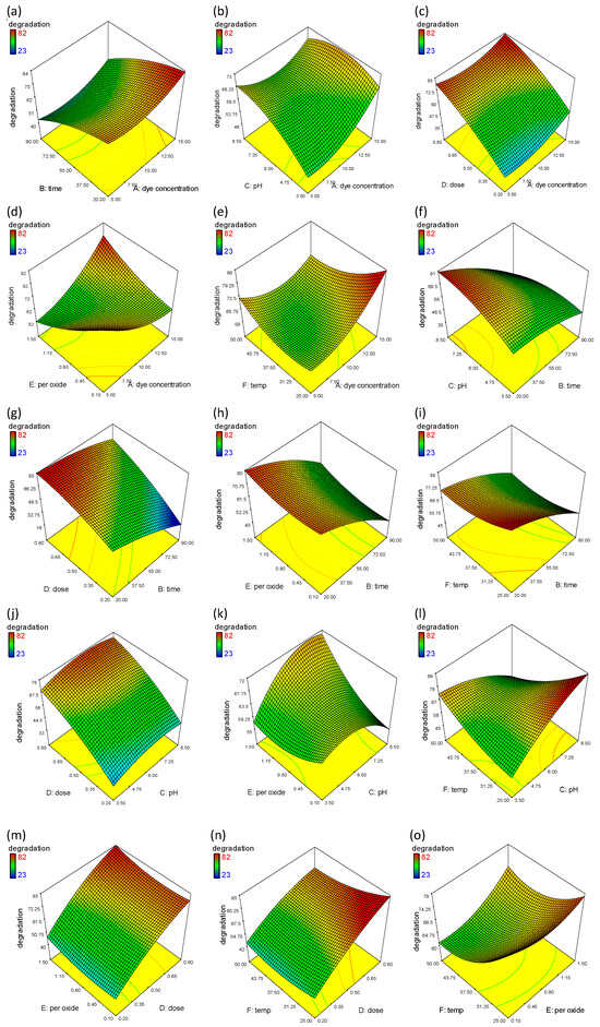 RSM plots showing the percentage degradation of MO and the interaction between selected variables. (a) The effect of dye concentration and time; (b) the effect of dye concentration and pH; (c) effect of dye concentration and dose; (d) effect of dye concentration and hydrogen peroxide; (e) effect of dye concentration and temperature; (f) effect of time and pH; (g) effect of time and dose; (h) effect of time and hydrogen peroxide; (i) effect of time and temperature; (j) effect of pH and dose; (k) effect of pH and hydrogen peroxide; (l) effect of pH and temperature; (m) effect of dose and hydrogen peroxide; (n) effect of dose and temperature; (o) effect of hydrogen peroxide and temperature.