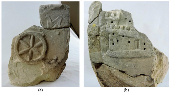 Moreover, it is known that braziers were common items in the funerary offerings of late medieval Hispanic Muslim and Christian homes [32]. They could be used for several purposes. The larger ones would serve as room heaters, whereas the smaller ones, as is the case of the piece preserved in the Museum of Montilla, could be used to heat people’s hands, keep food warm, and burn aromatic plants and perfumes. They could be metallic or carved from sandstone. The latter were very frequent [33], as is indicated by the numerous specimens found in Alhambra, since stone accumulates and retains heat more efficiently, and it offers a support that stands the thermal fluctuations caused by the flames.
