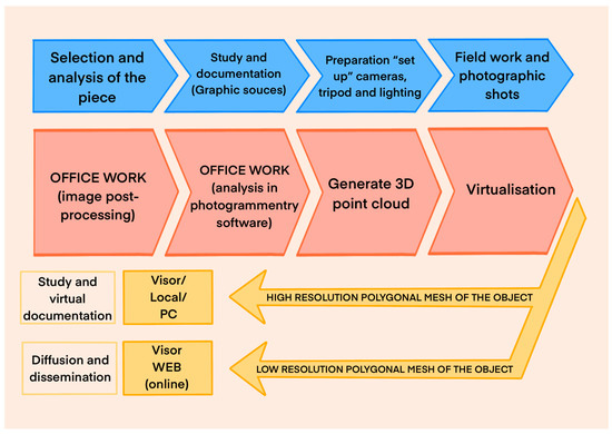 The study case presented is classified as a purely real element that includes physical pieces (small and large, related to engineering or architecture), buildings or parts of buildings, large areas of archaeological sites, monument complexes, and even large areas of the territory and landscape. In the attainment of these physical subjects transferred to the metaverse, short-range photogrammetry plays a fundamental role, especially in the section dedicated to the development of the practical exercise of transforming a late medieval perfume burner, which is integrated in the metaverse. Figure 2 shows a flowchart concerning the methodology to follow within this research. In the photogrammetric process, the piece was photographed from all possible viewing angles, recording the scale of the object and the correct light exposure through the setting of the camera. To this end, we used an automatised swivel bracket on a stable wooden base placed over easels, three flashlights equipped with 135 W and 5500 K LED lamps, which provide soft and diffuse light, a white felt background, a measuring ruler or scale, a ColorChecker Passport to calibrate the colorimetry of the image, a Manfrotto Befree GT tripode, and a 24.2 Mp Nikon D5300 Kit reflex digital camera with an AF-P 18–55 mm VR lens. Some preliminary premises were established to configure the camera in the manual mode and adjust the opening of the diaphragm and the optimal shutter speed, with the aim of maximising the definition and field depth of the images.