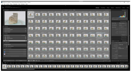 In the next step, the whites were correctly balanced to compensate the exposure within Adobe Lightroom 10 (Figure 3). Then, the images were sent to the reconstruction programme to maximise the sharpness of the alignment process. The next phase was the implementation of the photogrammetric restitution application. The photographs were aligned and adjusted; i.e., the photogrammetric software searched for photogrammetric pairs whose images had homologous points of the target piece and integrated them in a single point of the mesh that later created and conformed the virtual object. A total of 109 shots were taken by placing the piece on a rotating apparatus and shifting its axis of rotation twice. Between shots, the piece was rotated 10° to ensure an overlap of 70–80% of the images. In fact, one of the strategies when scanning a piece consists in running a perimeter around the object, known as photographic capture loop “CL” (Figure 4); in a CL, a certain variation is established between capture stops, to ensure that, in each photograph, the object is centred in the image. To obtain better results, more CLs can be performed from different angles. These images grant the photogrammetry software a basic framework that is later used to align and calculate the depth of the closest photographs.