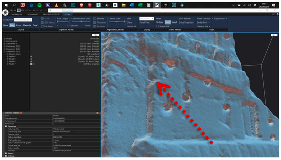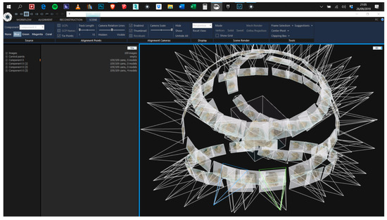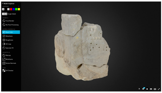 Once the basic framework was captured, the short- and medium-range photographs were taken. Since the first CL was approximately 3 m from the object, the medium-range CL was at 1.5 m, and the short-range or detail CL was at 50 cm. The photographs taken in the medium-range CL connected the farthest CL. Therefore, a correct planning of the process of photograph capture was necessary, ensuring 60–80% overlapping of images to obtain optimal results. Afterwards, we have the alignment and adjustment of the photographs, that is, Reality Capture 1.0 (RC). This process searches for the photograph pairs whose images have homologue points of the object in a single point of the mesh created to conform the 3D object. It was verified that all the images that were uploaded to the system did not belong to different groups. The duration of this process depends on the number and size of the images. However, it is fundamental to verify the number of points per image that have been aligned, in order to detect possible information losses. The reconstruction programme analysed the shapes of the photographs to generate a high-resolution point cloud. The colour of the photograph was transferred to each of the vertices to generate the texture of the polygonal mesh; thus, the different colours of the photographs were copied to each of the vertices to generate the texture.