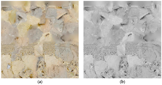 The high-resolution meshing command was executed. In this phase of the process, it is important to consider that all the equipment resources of CPU, GPU, and SSD/HDD are required; therefore, it is recommended that we programme this process in a resting schedule and with the equipment refrigerated. High-resolution meshes of 100–200 million polygons are usually obtained with the RC or Agisoft PhotoScan applications. However, to show an object in web viewers such as Sketchfab, it is necessary to reduce the resolution of the mesh to one million or one and a half million polygons, which can be achieved with programmes like MeshLab 2020.06 released and Zbrush. We then adapted the previous mesh to the means of visualisation that best suit the WebXR environment or metaverses. Through the re-topology procedure, all the details of the high-resolution polygonal mesh were transferred to the mesh with a lower resolution. Therefore, in the next step, the high-resolution texture to be applied to the object had to be extracted, establishing a resolution of 16k (16,000 pixels), which was then reduced to 4k or 8k (4000 and 8000 pixels, respectively) for exportation, thereby reducing the size of the file and its textures. Next, a texturing process was conducted, which consists in creating the different texture maps of the photographed surfaces. As is shown in Figure 6, the different parts of the textures are somehow placed or sewed on the model. In this way, the textures of the high-resolution geometry were adapted by the “baking” of such primitive textures in the low-resolution model, with the aim of applying the final material with the different layers in the virtualised 3D geometry.