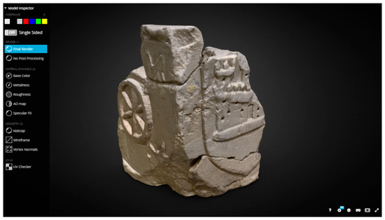The basic information of the object was retouched, the y-axis and the adequate scale to send to the necessary format in each case; in fact, the file was exported in the suitable format (OBJ). This re-edition was carried out in Autodesk 3DS Max, which basically consists in a UVW mapping; that is, the Cartesian coordinates XYZ were transferred to a 2D texture system, which was then used in the virtualised model; this process is known as texture mapping. Then, a second retouch was performed, adding the basic information of the object and the adequate scale to export it to the necessary format in each case. Lastly, the file in OBJ or FBX format to Sketchfab was loaded. Therefore, in this point prior to the metaverse, the following elements were extracted from the rendered piece: base texture, normal texture, reflection, high shines, displacement, normals, environmental occlusion, and all the maps to be configured (Figure 7). Finally, the virtualised piece was obtained, ready to be transferred to our metaverse through the VR headsets or any other device for this purpose.