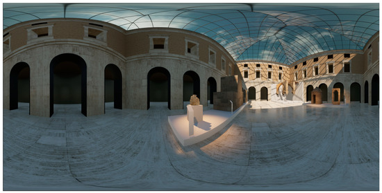Taking visual references that allow referencing the observed object is fundamental in order to place the visitor in a built context. The model chosen to equip this ethereal space where such elements were placed is the yard of the MAN-Spanish Architectural Museum, which served as a virtual context to immerse the visitor in the modellised heritage pieces. Therefore, any user can participate in an immersive experience of the metaverse, which is not a videogame or a mere puppet-like avatar, but a realm where everyone can freely experiment in another reality with their own bodies. As has been previously highlighted, it is difficult to transfer such an experience to the pages of this text. Thus, Figure 9 and Figure 10 present a walkthrough around this virtual scenario, where the user can inspect the different heritage pieces. The new space created does not constitute a traditional museum in which a historical piece is merely observed through a glass; instead, the user lives an immersive experience, being able to observe every detail he/she wants, no matter how small it is. This virtual environment grants the experience greater realism, freeing the user from the cold and hostile environment felt from the no-place of the metaverse; moreover, it provides the user with the necessary isolation to ensure the maximum immersive effect. The study recommends that museum decision-makers integrate technological innovation in their day-to-day, which can revitalise the cultural heritage in a different manner, and is much more attractive and immersive.