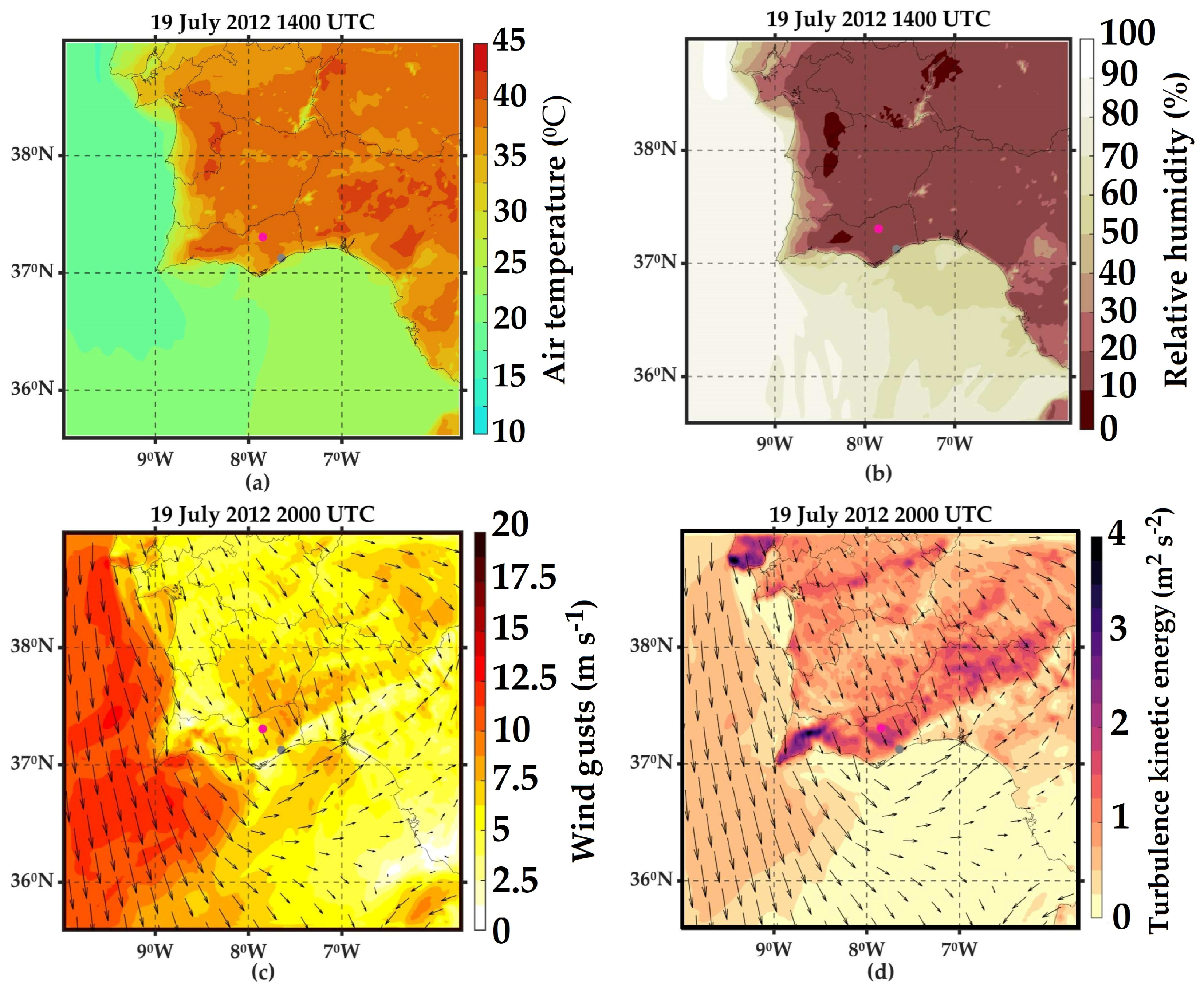- Purificação, C.; Andrade, N.; Potes, M.; Salgueiro, V.; Couto, F.T.; Salgado, R. Modelling the Atmospheric Environment Associated with a Wind-Driven Fire Event in Portugal. Atmosphere 2022, 13, 1124. [Google Scholar] [CrossRef]