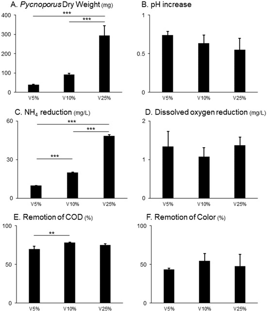 (A) Biomass production of Pycnoporus sp. on vinasse after 60 days of incubation on 5, 10 and 25% dilution of vinasse; (B–F) bioremediation results analysis of the vinasse. Statistically significant differences between treatments are shown as ** p < 0.001, *** p < 0.0001.