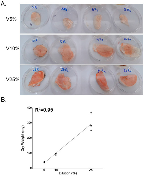 (A) Photos of Pycnoporus sp. growth after 60 days on 5, 10 and 25% of vinasse; and (B) Lineal Regression Model between dilution of vinasse (%) and dry weight (mg).