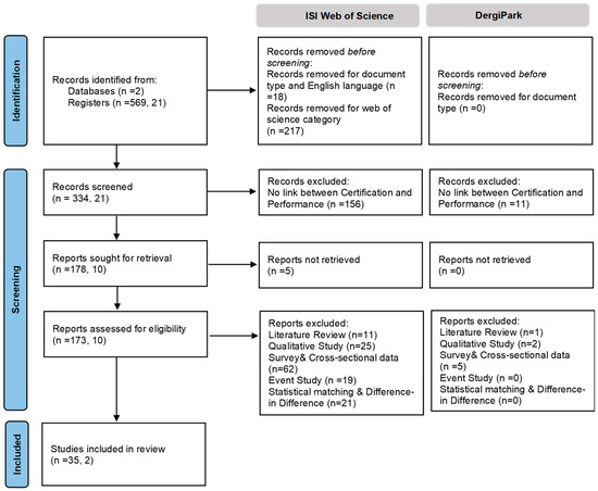 To capture as many relevant studies as possible, a structured keyword search on the ISI Web of Science (WoS) database is conducted. The ISI Web of Science (WoS) database has comprehensive coverage of high-impact journals published in Elsevier, IEEE, Springer, and Taylor & Francis, etc. The following keyword string (ISO certification) and (operational performance) or (financial performance) or (economic performance) is searched in the title, abstract, and keywords. The initial search query (1 March 2024) returned 569 articles in WoS. After filtering for peer-reviewed impact factor publications such as articles, proceeding papers, review articles, and book chapters and English-language articles, 551 remained for evaluation. The search is further refined by including articles strictly from Business, Business Finance, Economics, Engineering Industrial, Engineering Manufacturing, Environmental Studies, Management, and Operations Research Management Science fields and 334 articles remained for evaluation. Based on the screening of the title and the abstracts, the studies can be grouped under (i) Literature Reviews on ISO certification, (ii) determinants of ISO certification and critical success factors for adaptation, (iii) The environmental effects of ISO certification, and (iv) The influence of ISO certification on operational, financial, or economic performance. For the research purposes of the study, the focus is on the last group and 178 publications are shortlisted for full paper reading. Moreover, to capture the relevant studies written about the Turkish Context DergiPark Database (https://dergipark.org.tr/en/ accessed on 1 March 2024 ), the leading database for Turkish Academic Studies is searched. The keyword string (ISO certification) and (operational performance) or (financial performance) or (economic performance) is searched in the title, abstract, and keywords. The initial search query returned 21 articles. Since DergiPark Data does not offer filtering for academic fields, a title and abstract screening has been conducted and 10 publications are shortlisted for full paper reading. Figure 1 depicts the flow diagram for the identification of studies.