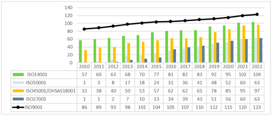 As literature has focused its attention on ISO 9001, in Turkish practice the most common certification is ISO 9001, followed by ISO 14001 and ISO 45001/OHSAS 18001. All certifications show a positive trend. Figure 3 depicts the certification dynamics throughout the period 2010–2022. During the observed period, five companies have never been certified. Most of the companies renewed their certification once the certificate expired. Only four companies did not renew their certification. In total, 21 companies followed single certification strategy throughout the observation period: 20 of them are holding ISO 9001, and only one company ISO 14001. A total of 66 companies acquired single certification at first and gradually switched to multiple certification strategy. In total, 52 companies followed the multiple certification strategy, and 30 of them acquired all certifications at the end of 2022.