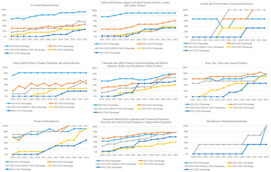 Figure 4 depicts percentage of certified companies by industry and year for all certifications. The most popular certification in Food and Kindred Products industry is ISO 9001. In total, 92% of businesses are ISO 9001 certified by 2022. ISO 9001 is closely followed by ISO 14001, but as of 2019, despite the slow start, the proportion of companies with ISO 45001/OHSAS 18001 has surpassed that of ISO 14001 companies. In the Textile Mill Products, Apparel and other Finished Products, Leather and Leather Products industry, ISO 90001, ISO 140001, and ISO 50001 are the most common certifications. In the Lumber and Wood Products, Furniture and Fixtures industry, as of 2016, every company in the sector has an ISO 45001/OHSAS 18001 certificate; by 2020, all companies have an ISO 14001 certificate. The third widely used certification in the sector is ISO 9001. In Paper Allied Products, Printing, Publishing, and Allied Industries, ISO 9001 is the most widely used certification. However, by 2022, 82% of firms have ISO 9001 certification. ISO 9001 is closely followed by ISO 14001, but as of 2022, the ratio of companies with ISO 45001 has exceeded the ratio of those with ISO 14001. The most popular certifications in the Chemicals and Allied Products, Petroleum Refining and Related Industries, Rubber and Miscellaneous Plastic Products industry are ISO 14001 and ISO 9001. By 2022, 79% of the companies have ISO 9001 and ISO 140001, 67% have ISO 45001/OHSAS 18001, 54% have ISO 27001, and 42% have ISO 50001 certification. By 2022, 77% of companies in the Stone, Slay, Glass and Concrete Products industry are ISO 9001 and ISO 140001, 69% of the companies ISO 45001/OHSAS 18001 and ISO 50001, and 46% of the companies ISO 27001 certified. In the Primary Metal Industries, ISO 14001, ISO 45001/OHSAS 18001, and ISO 9001 certificates are the most widely used certifications. As of 2019, all the companies hold ISO 14001 and ISO 45001 certifications, with 90% of the companies having obtained ISO 9001 and ISO 50001 certifications by 2022. Moreover, one of the two businesses in the sector acquired ISO 27001 certification by 2022. The most used certifications for Fabricated Metal Products, Industrial and Commercial Machinery, Electronic and other Electrical Equipment, Transportation Equipment industry are ISO 14001 and ISO 9001, with ISO 45001/OHSAS 18001 gaining traction in 2022. With 60% of the companies holding ISO 27001 certification in 2022, this industry is the most widely ISO 27001 certification-used industry. Lastly, in the Miscellaneous Manufacturing Industries in 2019, two out of three companies in the industry had ISO 140001 and ISO 45001/OHSAS 18001 certifications, whereas in 2022, all companies have ISO 140001, ISO 45001/OHSAS 18001, and ISO 9001 certifications.