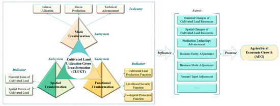 Cultivated land, as a fundamental pillar of agricultural systems, is essential for ensuring national food security and driving progress in agriculture and rural development [1]. However, increasing population, disordered consumption, and unsustainable land management practices have given rise to a myriad of issues, including the degradation of cultivated land systems, soil contamination, and ecological damage [2]. Accordingly, these challenges hinder the responsible and sustainable utilization of cultivated land resources [3,4]. In light of ongoing efforts to cultivate ecological civilization and a green paradigm shift in agriculture and rural areas, the academic community is increasingly interested in strategies for achieving green cultivated land resource utilization. Meanwhile, agricultural economic growth is also gaining significant attention. Therefore, cultivated land utilization green transformation (CLUGT), as a critical component of agricultural green transformation, represents a critical measure and safeguard for sustainable cultivated land use, agricultural economic growth, and environmental protection [5]. In contrast to conventional cultivated land use transformations, CLUGT prioritizes environmental protection and the advancement of sustainable agricultural development. This approach enhances cultivated land productivity and emphasizes maintaining a healthy and resilient cultivated land system. In addition, it encourages the dissemination of sustainable cultivated land utilization practices, such as natural and organic agriculture. By cultivating the intensive use of cultivated land, technological innovation, and shifting towards green production patterns, CLUGT can facilitate spatial and functional transformations in cultivated land utilization.