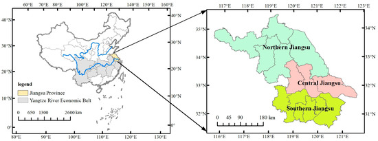 Jiangsu Province, situated as an economically advanced region in eastern coastal China, maintains its status as a critical grain-producing area nationally despite its limited cultivated land area. In 2021, the region had a grain yield of 37.461 million tons and an agricultural economic gross output value reaching CNY 1.05 trillion, securing its position among the nation’s leaders [17]. In contrast to other grain-producing provinces, Jiangsu faces challenges where a large population possesses relatively limited cultivated land. This constraint and a high degree of industrialization and urbanization present a unique set of issues and challenges for cultivated land utilization. These include shifts in rural land resource utilization methods and peasant employment patterns, land quality degradation due to over-exploitation of cultivated land, and agricultural contamination resulting from the intensive use of pesticides, fertilizers, and other chemicals [18,19]. Therefore, assessing CLUGT in Jiangsu Province and its implications for AEG carries significant practical implications. This understanding is crucial for informing the utilization, protection, and sustainable development of cultivated land and agriculture in economically developed regions.