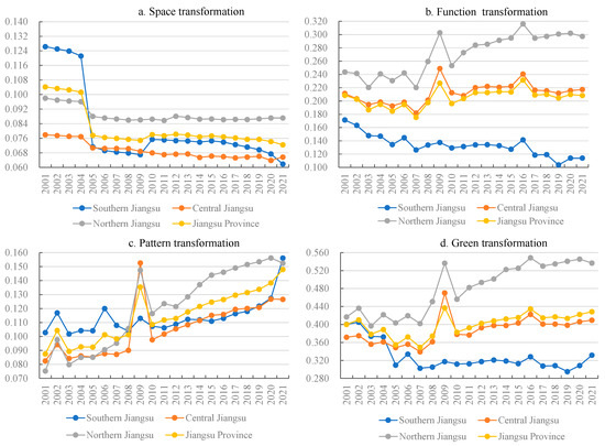 To further illustrate the characteristics of the temporal evolution of CLUGT in Jiangsu, Figure 3 presents index evolution trend charts. These charts depict the spatial transformation, functional transformation, mode transformation, and green transformation of cultivated land utilization in Southern Jiangsu, Central Jiangsu, Northern Jiangsu, and the entire province, based on the calculation results.