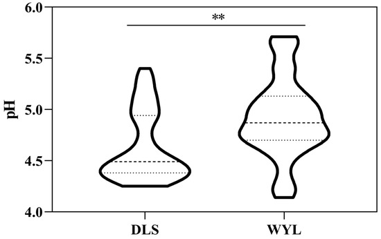 Distribution of forest soil pH in DLS and WYL forests. Note: The middle dotted line represents the median; the upper and lower dotted lines represent the upper and lower quartiles, respectively. ** indicates a significant difference at the 0.01 level.