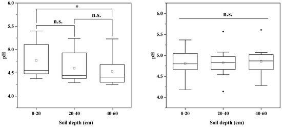Relationship between forest soil pH and soil depth in DLS (left) and WYL (right). * indicates a significant difference at the 0.05 level; n.s. indicates no significant difference.