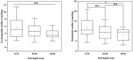 Relationship between exchangeable and hydrolytic acidities of forest soils and soil depth in WYL. * indicates a significant difference at the 0.05 level; n.s. indicates no significant difference.