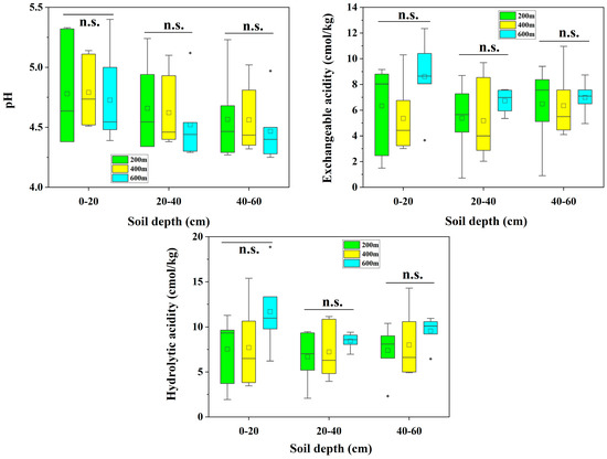 Relationships among pH, exchangeable acidities, and hydrolytic acidities of forest soils of different layers and altitudes in DLS. Note: 200 m, 400 m, and 600 m represent different altitudes. n.s. indicates no significant difference. Same as below.