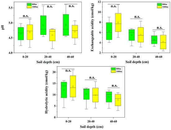 Additionally, for the different depth soils in WYL, with the increase in altitude, the mean values of soil pH were 4.64 and 4.69 (800 and 1000 m) for 0–20 cm, 4.92 and 4.59 (800 and 1000 m) for 20–40 cm, and 4.93 and 4.71 (800 and 1000 m) for 40–60 cm. With the increase in altitude, the mean exchangeable acidity of 0–20, 20–40, and 40–60 cm soils were 6.26 and 7.96 (800 and 1000 m), 5.51 and 5.54 (800 and 1000 m); and 4.58 and 4.13 cmol/kg (800 and 1000 m), respectively. With increasing altitude, the mean values of hydrolytic acid of 0–20, 20–40, and 40–60 cm soils were 12.13 and 13.71 (800 and 1000 m), 10.31 and 9.91 (800 and 1000 m), and 9.04 and 7.69 cmol/kg (800 and 1000 m), respectively. Similar to the forest soil of DLS, there were no significant differences in the mean soil pH and exchangeable and hydrolytic acidities at different altitudes (800 and 1000 m) (Figure 6).