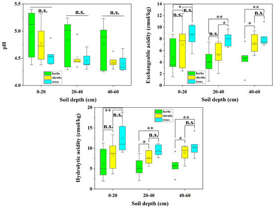 Relationships among soil pH, exchangeable and hydrolytic acidities, and plant types in different layers of forest soils in DLS. * indicates a significant difference at the 0.05 level; ** indicates a significant difference at the 0.01 level; n.s. indicates no significant difference.
